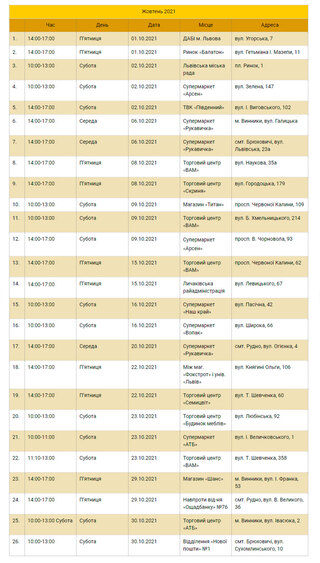 Нижче можна ознайомитися із графіком стоянок еко-буса на жовтень: