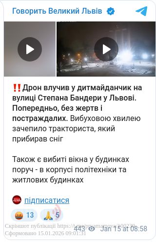 Сьогодні, 15 січня, вранці у Львові зафіксовано влучання шахеда.