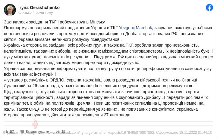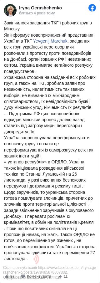 «Україна ініціювала розведення військової техніки у Станиці Луганській на 26 листопада, у разі виконання безпекових передумов і дотримання режиму тиші», - написала Геращенко.