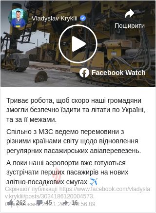 «Триває робота, щоб скоро наші громадяни змогли безпечно їздити та літати по Україні та за її межами. Спільно з МЗС ведемо перемовини з різними країнами світу щодо відновлення регулярних пасажирських авіаперевезень», – вказав міністр.