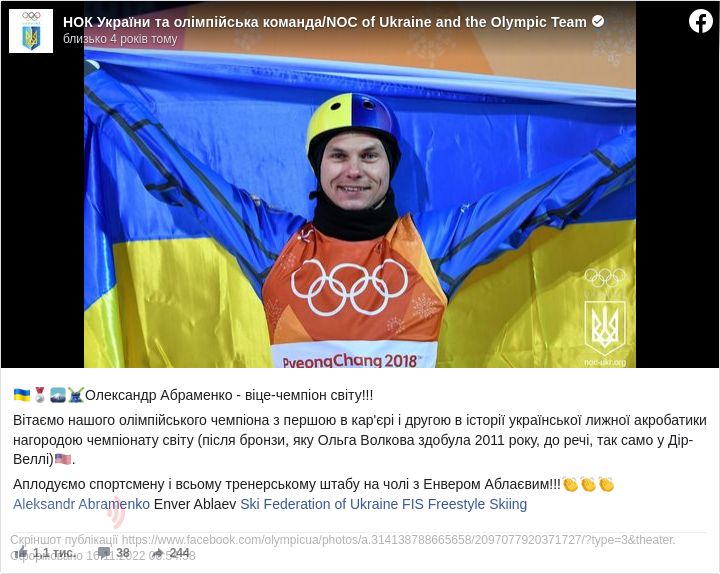 Український фрістайліст, чемпіон Олімпійських ігор 2018 року Олександр Абраменко здобув «срібло» на чемпіонаті світу з фрістайлу та сноубордингу.