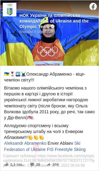 Як пише «Укрінформ», у суперфіналі змагань із лижної акробатики українець виконав стрибок Back-Double-Full-Full-Full і набрав 126.24 балів,