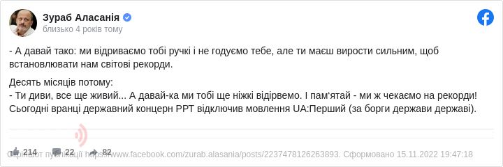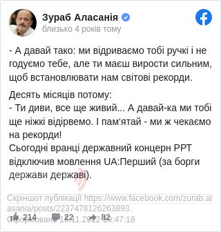 «Сьогодні вранці державний концерн РРТ відключив мовлення UA:Перший (за борги держави державі)», – заявив він.