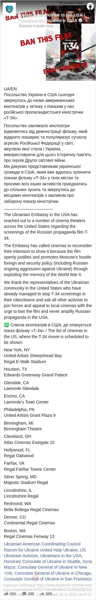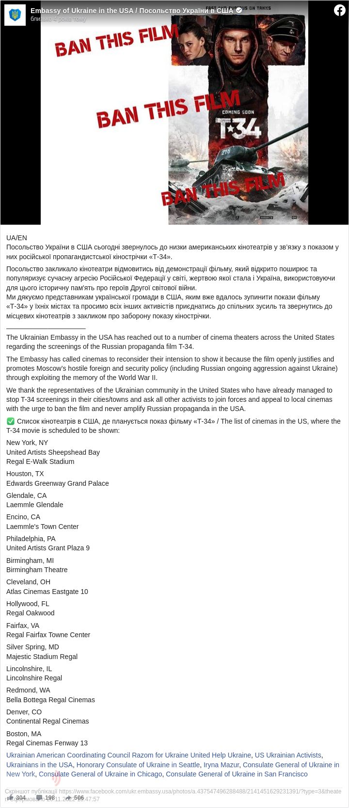 «Посольство України в США сьогодні звернулось до низки американських кінотеатрів у зв’язку з показом у них російської пропагандистської кінострічки »Т-34«, – зауважили в українському дипломатичному представництві.