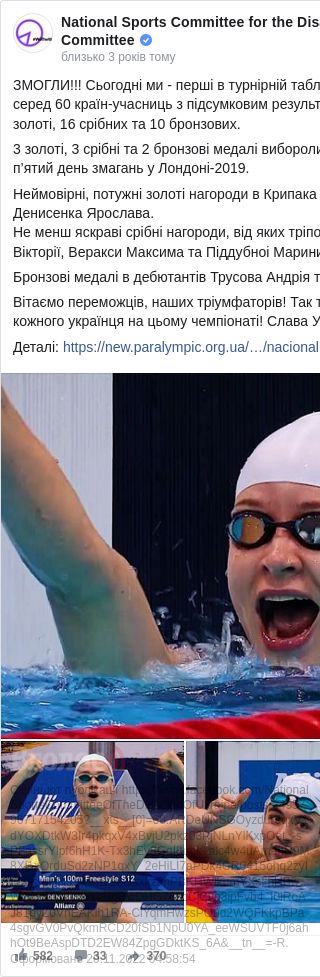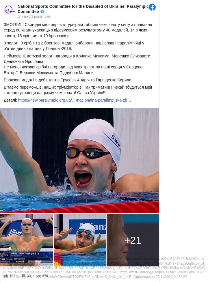 «Сьогодні ми – перші в турнірній таблиці чемпіонату світу з плавання серед 60 країн-учасниць з підсумковим результатом у 40 медалей, 14 з яких – золоті, 16 срібних та 10 бронзових», – повідомляє Національний Паралімпійський комітет.