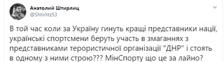 «В той час коли за Україну гинуть кращі представники нації, українські спортсмени беруть участь в змаганнях з представниками терористичної організації »ДНР« і стоять в одному з ними строю? МінСпорту, що це за л*йно?» - написав він.