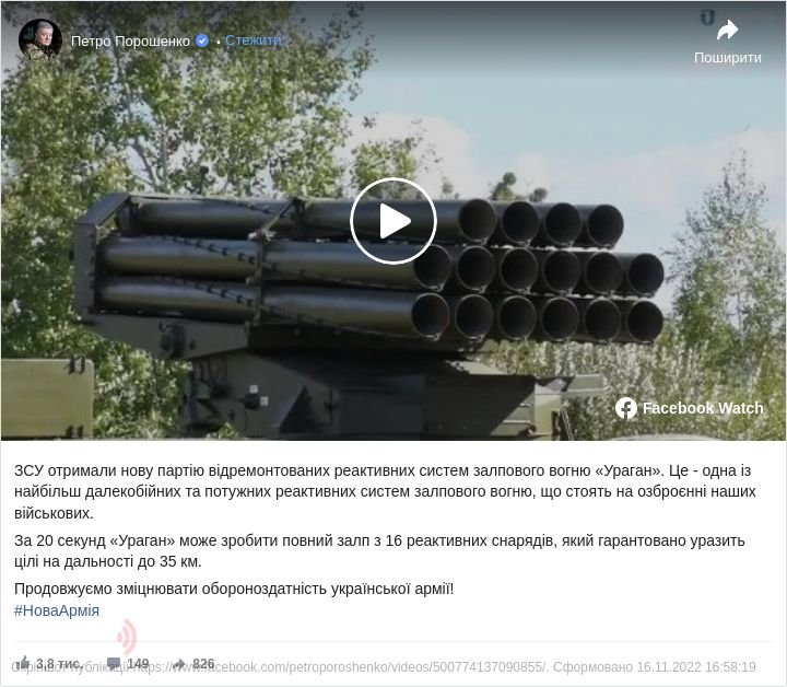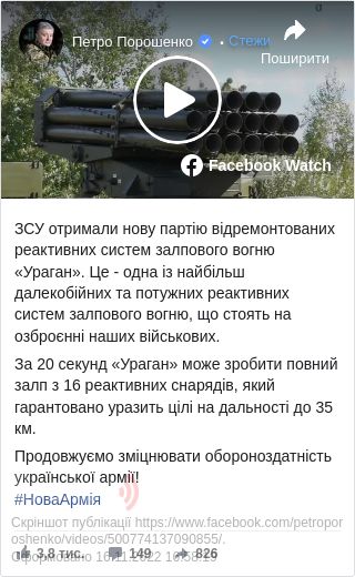 "ЗСУ отримали нову партію відремонтованих реактивних систем залпового вогню "Ураган". Це — одна із найбільш далекобійних і потужних реактивних систем залпового вогню, що стоять на озброєнні наших військових. За 20 секунд "Ураган" може зробити повний залп із 16-х реактивних снарядів, який гарантовано уразить цілі на дальності до 35 км", — зазначив глава держави і додав, що влада продовжує "зміцнювати обороноздатність української армії".
