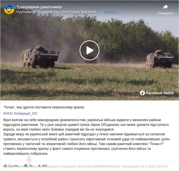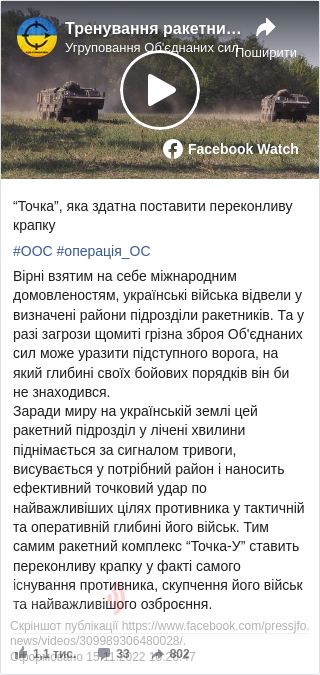 "Заради миру на українській землі ці ракетні підрозділи в лічені хвилини піднімаються по тривозі, висуваються в потрібний район і наносять ефективний точковий удар по найважливішим цілям противника в тактичній і оперативній глибині його військ. Тим самим ракетний комплекс "Точка-У" ставить переконливу крапку в факті самого існування противника, скупчення його військ і найважливішого озброєння", - йдеться у повідомленні.