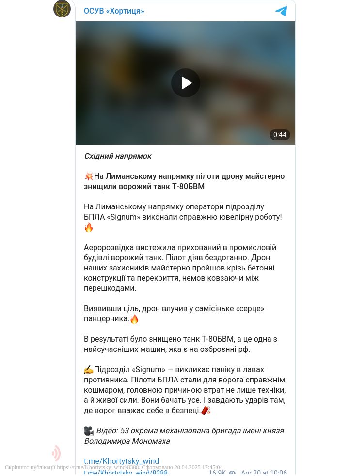 Оператори підрозділу «Signum» знищили дронами на Лиманському напрямку найсучасніший російський танк Т-80БВМ.