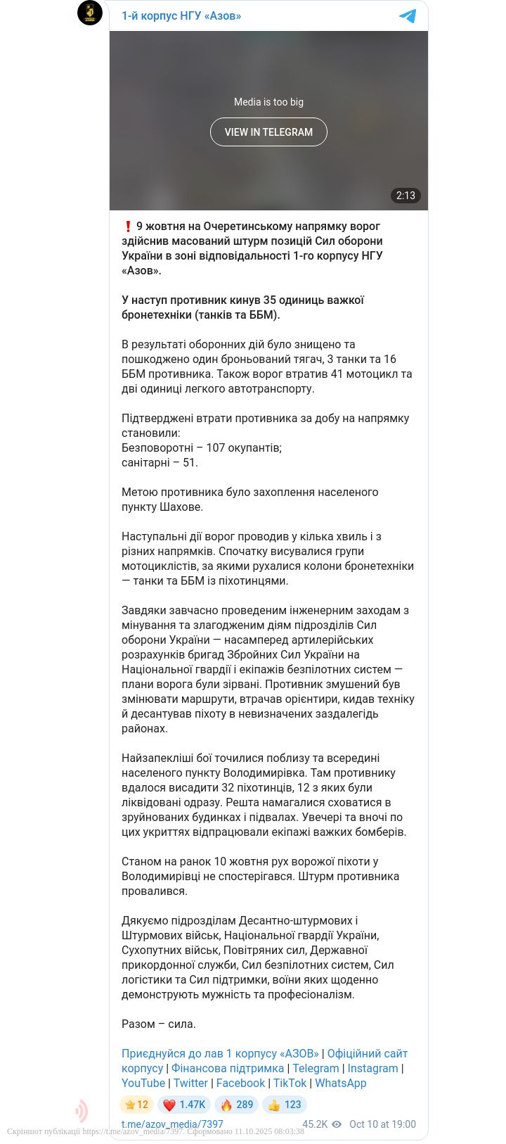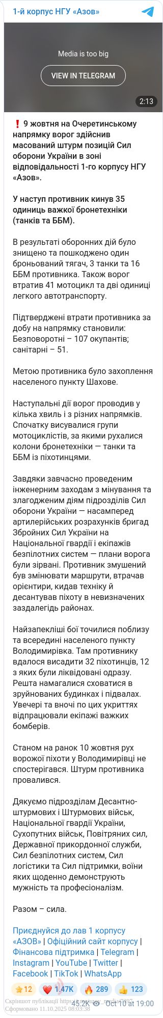 "Станом на ранок 10 жовтня рух ворожої піхоти у Володимирівці не спостерігався. Штурм противника провалився", - написали військові.