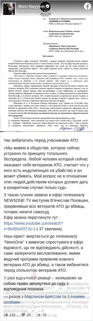 «З такою гучною заявою в ефірі телеканалу »Newsone« виступив В'ячеслав Піховшек, прирівнявши всіх ветеранів АТО до вбивць, готових чинити самосуд», - написав у Facebook юрист і брат депутата Маси Найєм.