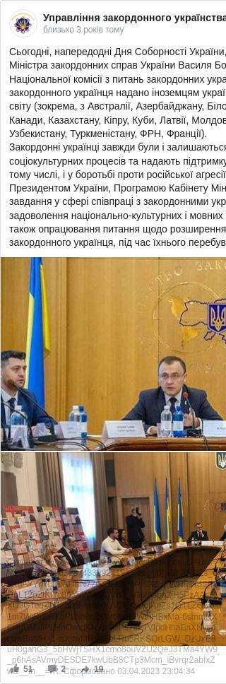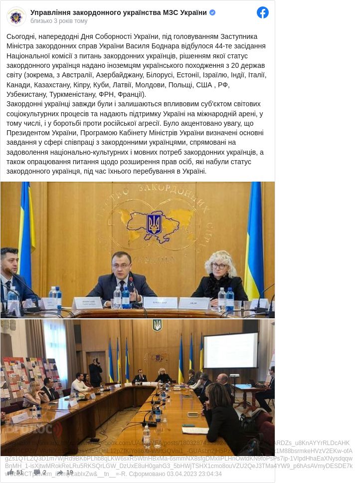 «Напередодні Дня Соборності України під головуванням заступника міністра закордонних справ України Василя Боднара відбулося 44-те засідання Національної комісії з питань закордонних українців, рішенням якої статус закордонного українця надано іноземцям українського походження з 20 держав світу (зокрема, з Австралії, Азербайджану, Білорусі, Естонії, Ізраїлю, Індії, Італії, Канади, Казахстану, Кіпру, Куби, Латвії, Молдови, Польщі, США, РФ, Узбекистану, Туркменістану, ФРН, Франції)», - зазначають у відомстві.