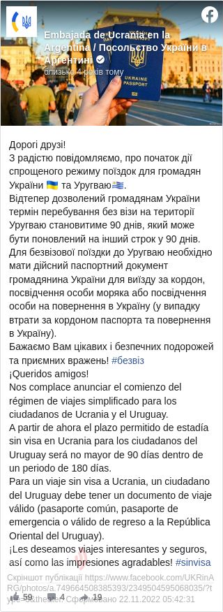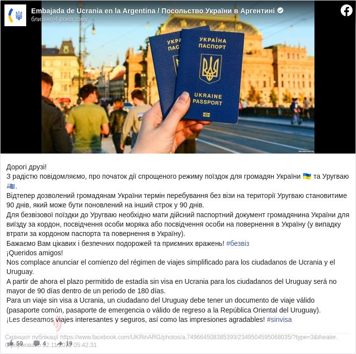 "Відтепер дозволений громадянам України термін перебування без візи на території Уругваю становитиме 90 днів, він може бути поновлений на другий термін у 90 днів", - повідомляється на сторінці посольства в соцмережі Facebook у п'ятницю.