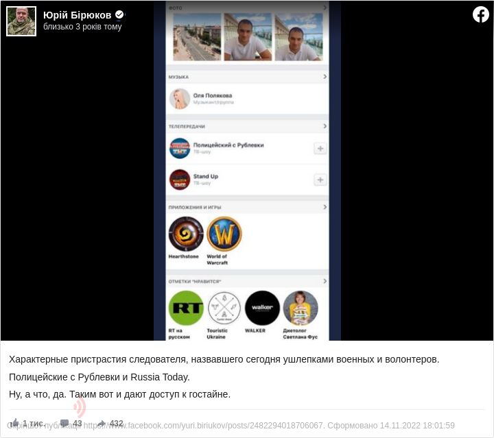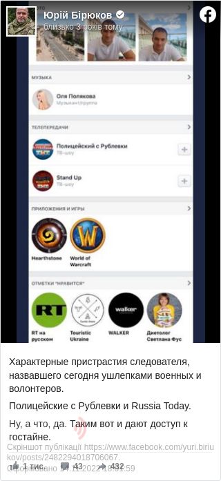 Так, волонтер, радник п'ятого президента України Юрій Бірюков опублікував скріншот його сторінки у Facebook.