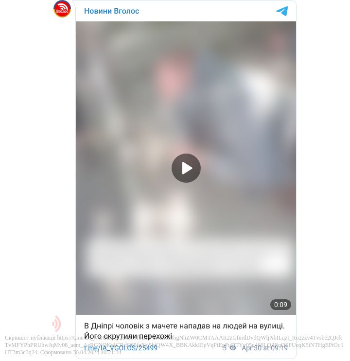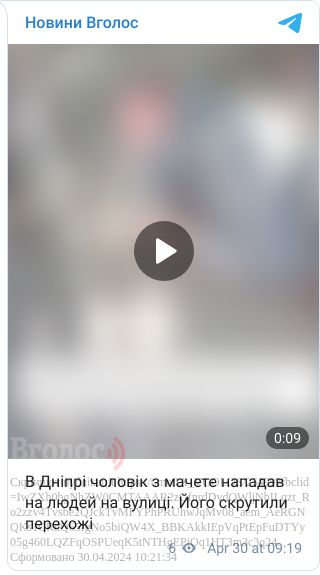 Один із перехожих попрохав його прибрати зброю, але чоловік у відповідь замахнувся на нього. Захиститися від нападника містянину вдалося за допомогою стільця, вибивши мачете з його рук. Поза тим свідки інциденту втрутилися та повалили неадекватного громадянина на землю. На щастя, минулося без постраждалих.