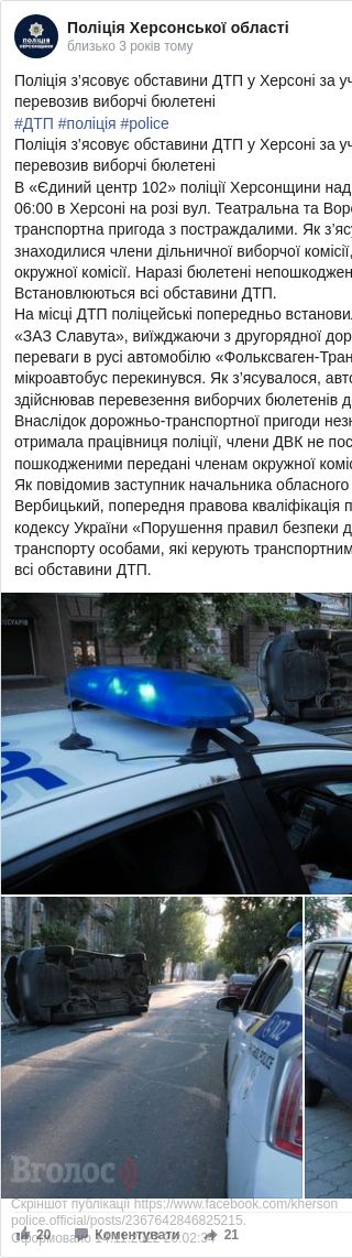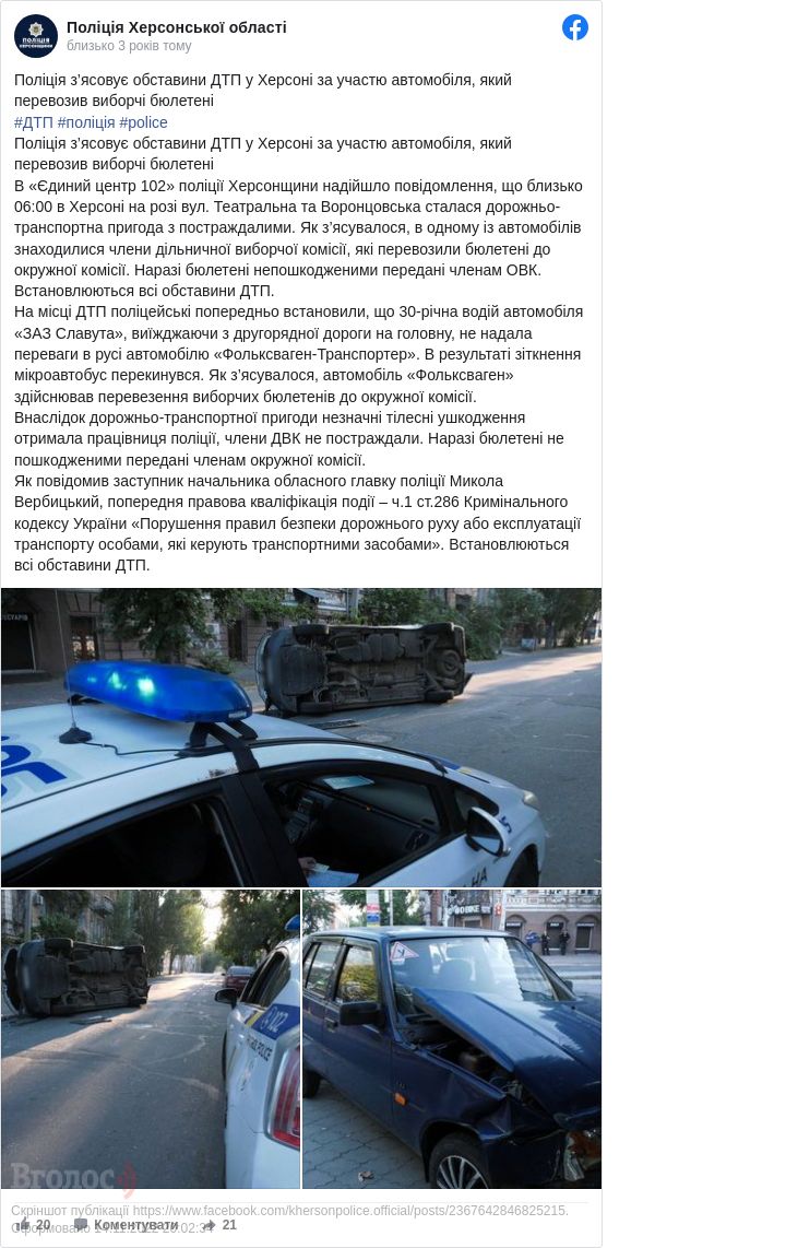 У Херсоні мікроавтобус «Фольксваген», який перевозив членів ДВК та бюлетені, потрапив в аварію та перекинувся. Постраждала одна людина.