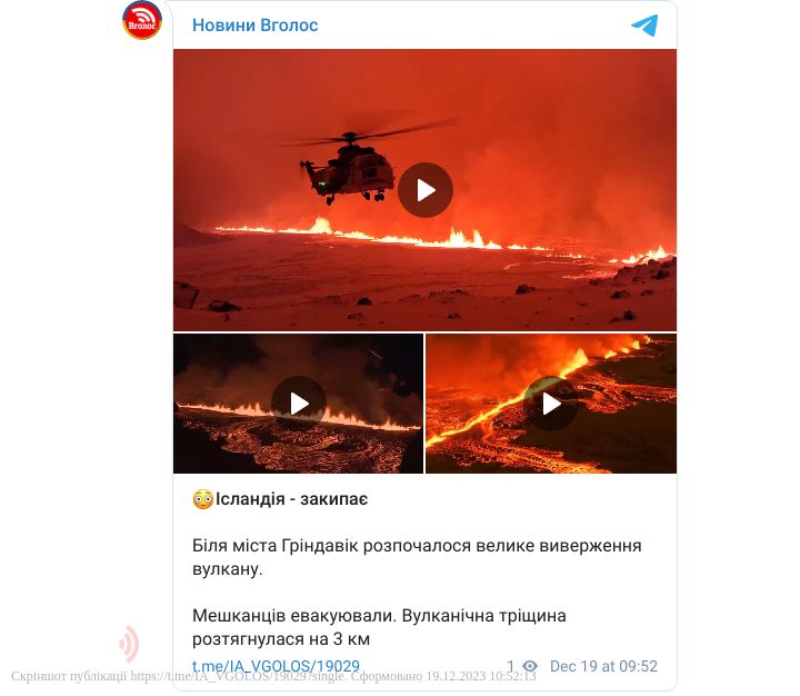 В Ісландії почалося виверження вулкана на півострові Рейк'янес. Влада евакуювала майже 4000 жителів рибальського містечка Гріндавік.