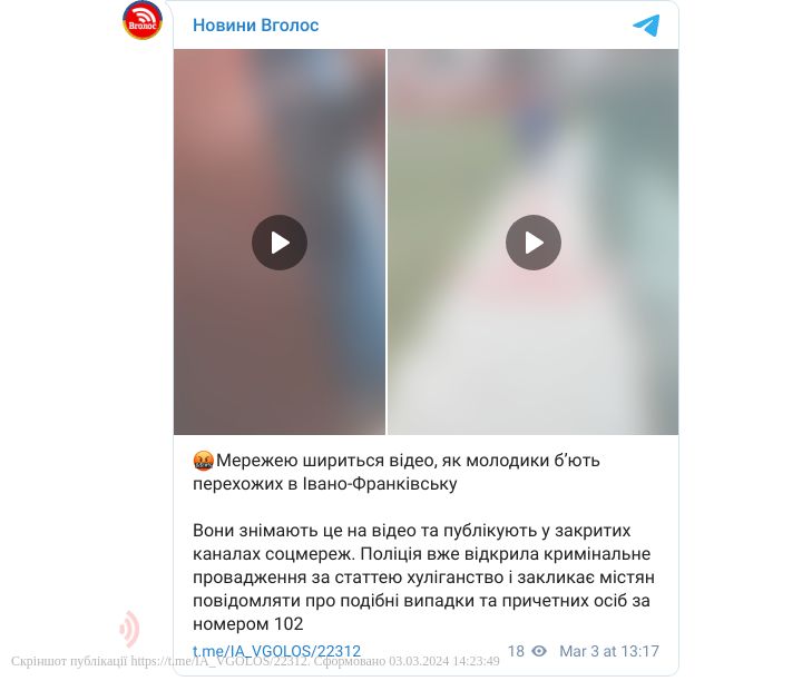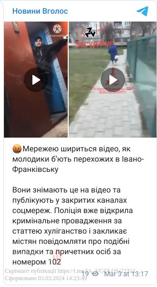 «На відео правопорушники завдавали випадковим перехожим тілесних ушкоджень, а також застосовували газові балончики. За допомогою до поліцейських поки ніхто не звертався», — йдеться у дописі.