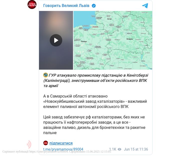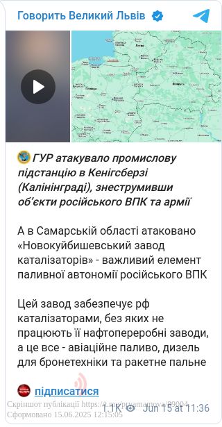 14 червня ГУР здійснили атаку на електропідстанцію в м. Кенігсберг (Калінінград). Повністю припинене постачання електроенергії в районі проведення операції.