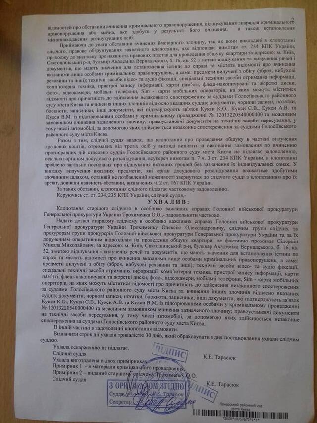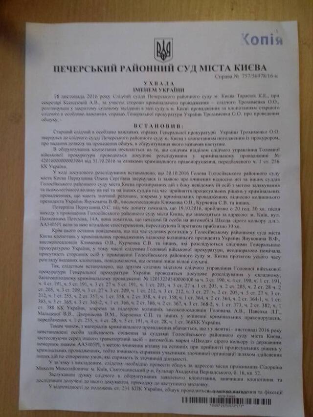 Він опублікував повний текст ухвали Печерського районного суду, в якому вказано, що наприкінці жовтня голова Голосіївського райсуду Києва Олена Первушина звернулася через вчинення проти неї та інших суддів протиправних дій, а саме «залякування і психологічного тиску у кримінальних провадженнях, що мають значний резонанс, а саме відносно колишнього президента Януковича, високопосадовця Клименка, Курченка та інших».