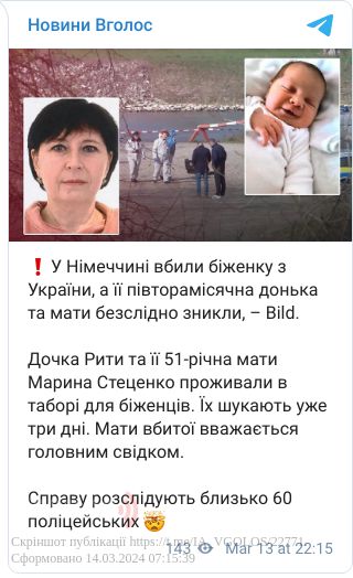 Матір вбитої жінки та її новонароджена донька, якій лише п'ять тижнів, зникли безвісти. Поліція розшукує матір вбитої - 51-річну Марину Стеценко, яку вважають свідком злочину. За інформацієї поліції, 27-річна жінка загинула через насилля. Раніше вона вважалася зниклою безвісти.