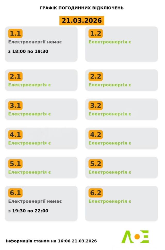 У суботу, 21 березня, на Львівщині будуть діяти графіки відключення світла. Електроенергію вимикатимуть протягом дня кільком групам.