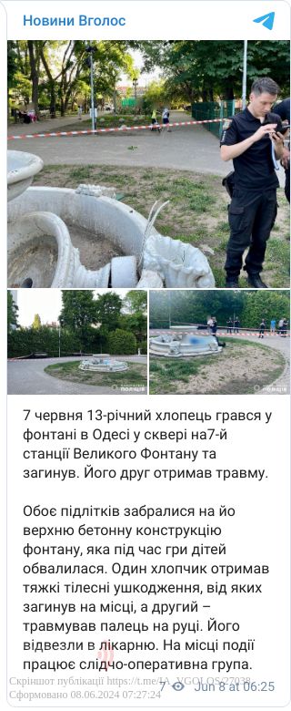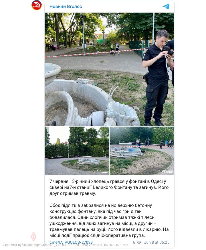 7 червня 13-річний хлопець грався у фонтані в Одесі у сквері на 7-й станції Великого Фонтану та загинув.