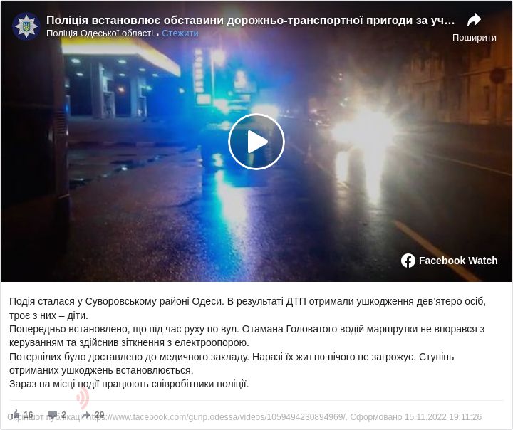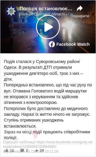 Попередньо відомо, що під час руху по вул. Отамана Головатого водій маршрутки не впорався з керуванням та здійснив зіткнення з електроопорою.