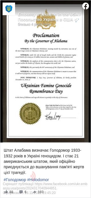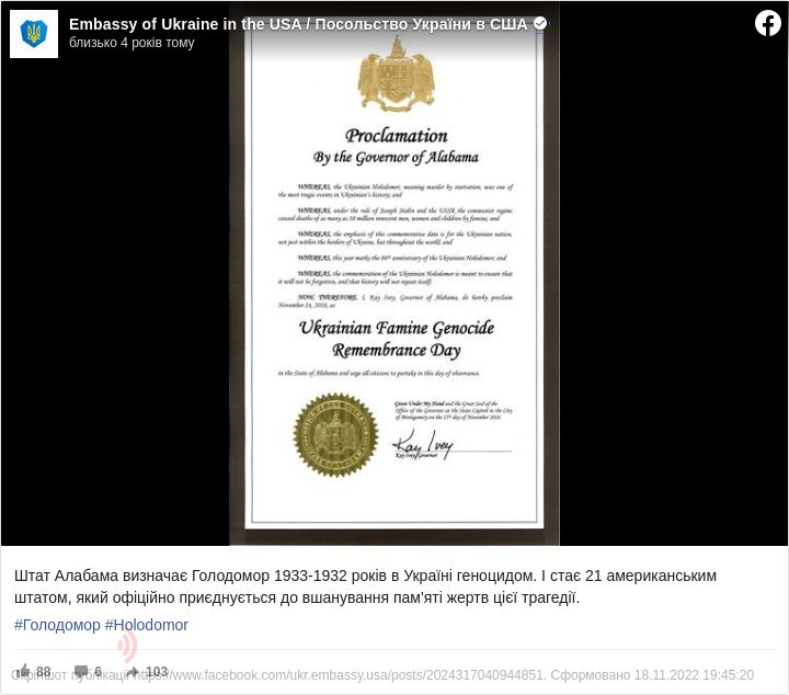 "Я, губернатор штату Алабама Кей Айві, цим документом проголошую 24 листопада 2018 року днем пам'яті Голодомору українського народу в штаті Алабама", - йдеться в документі.