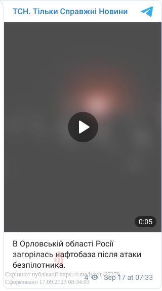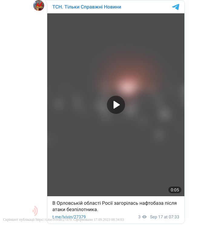 В російській Орловській області загорілась нафтобаза після атаки безпілотника.