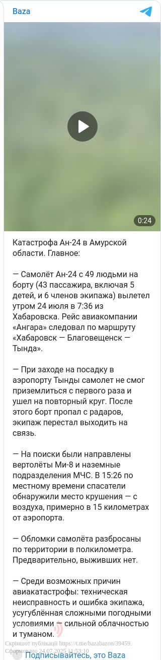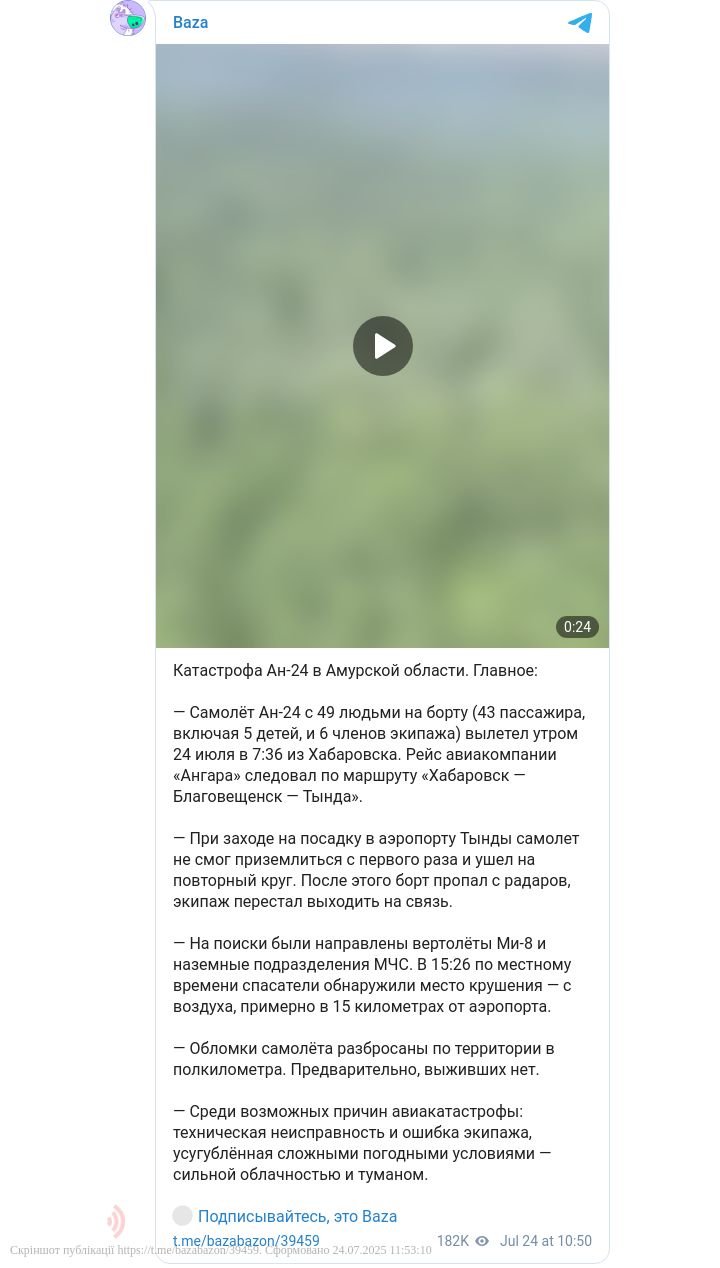 У четвер, 24 липня, в Амурській області Росії зник зв'язок з пасажирським літаком Ан-24, на борту якого перебували понад 40 осіб. Пізніше виявлено палаючий фюзеляж повітряного судна.