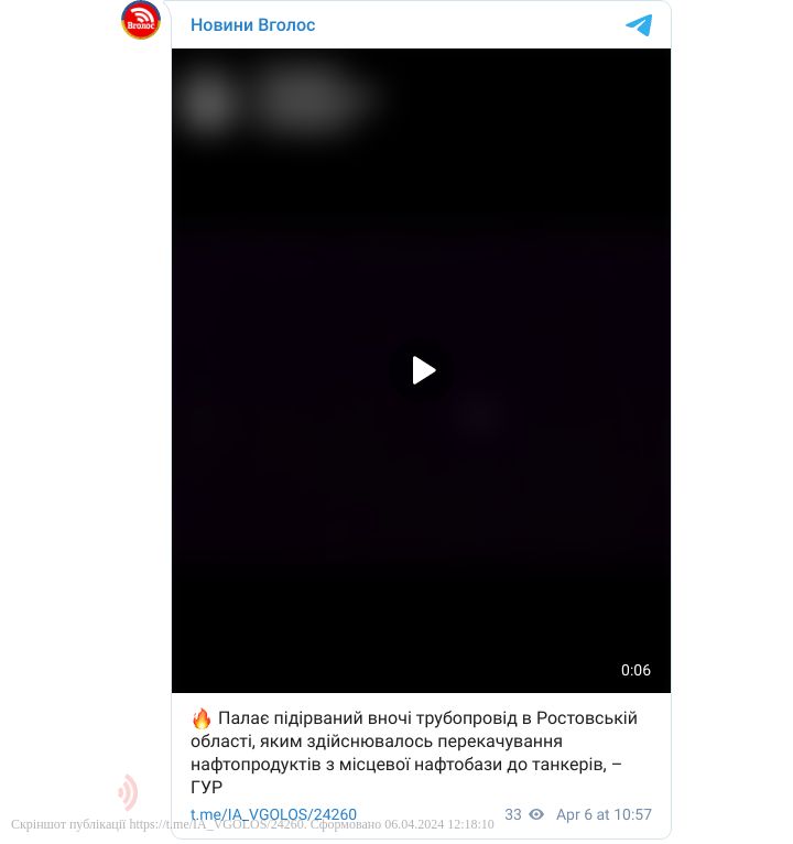 «В ніч на 6 квітня 2024 року, в районі населеного пункту Азов (Ростовська область) трапився підрив трубопроводу, яким здійснювалось перекачування нафтопродуктів з місцевої нафтобази до танкерів у припортовій території "Азовського морського порту», - йдеться у повідомленні.