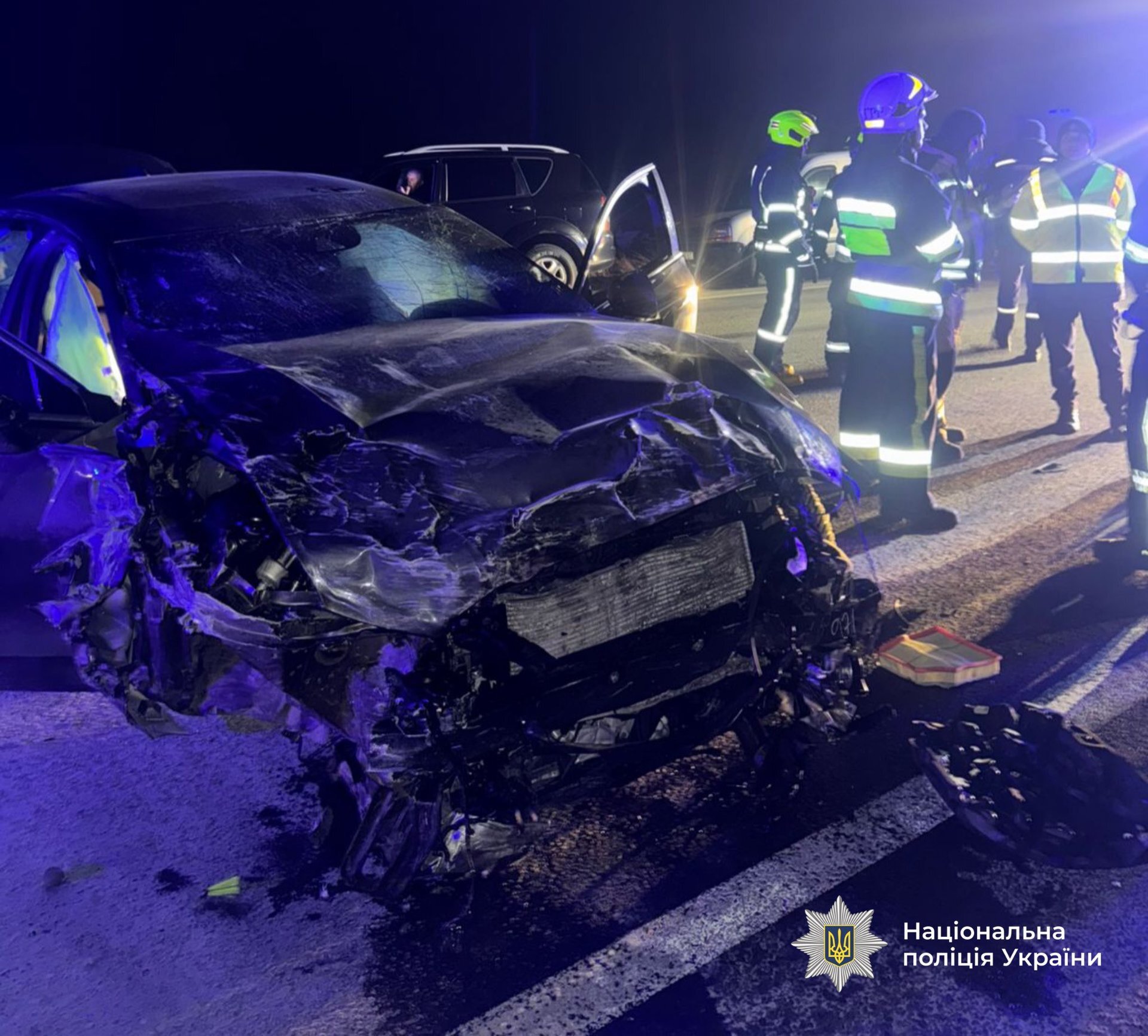 На місці події працює слідчо-оперативна група та криміналісти, які встановлюють усі обставини та причини автопригоди.