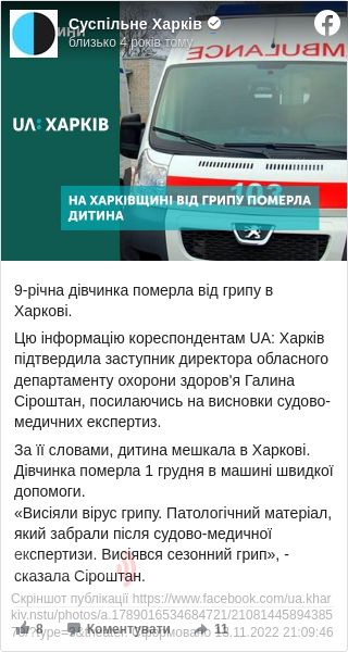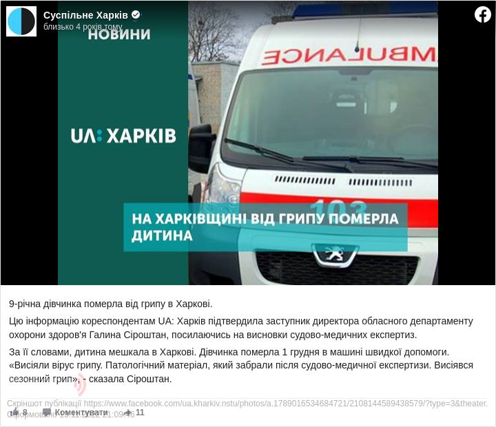 За результатами судово-медичної експертизи, у загиблої дівчинки виявили вірус сезонного грипу.