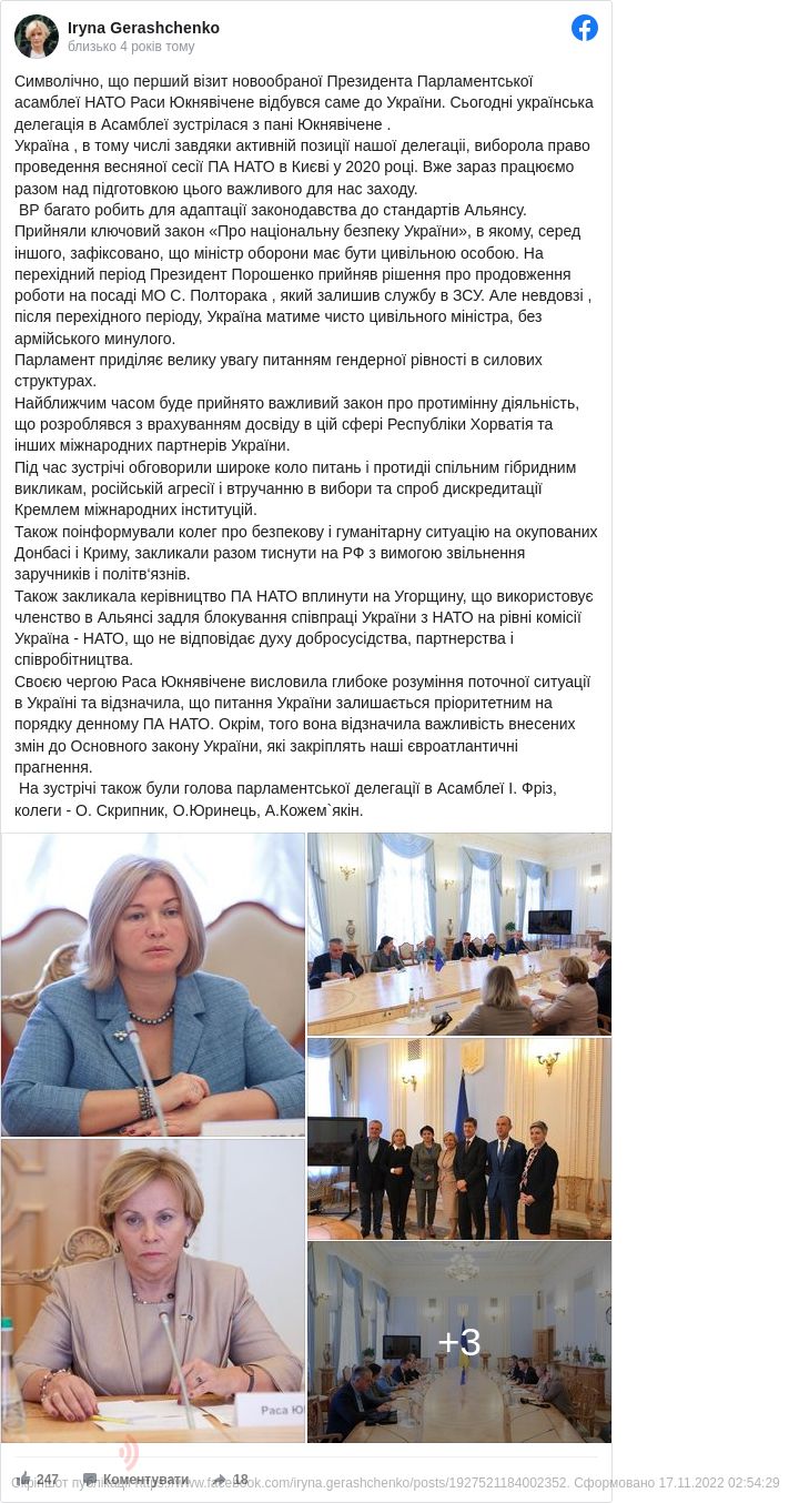 Своєю чергою, Раса Юкнявічєнє висловила глибоке розуміння поточної ситуації в Україні. Вона також зазначила, що питання України залишається пріоритетним на порядку денному ПА НАТО. Крім цього, вона відзначила важливість внесених до Конституції України змін, що закріплять євроатлантичні прагнення держави.