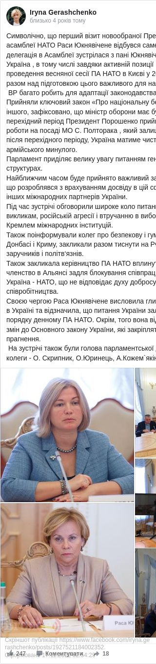 "Уже зараз працюємо разом над підготовкою цього важливого для нас заходу. ВР багато робить для адаптації законодавства до стандартів Альянсу. Прийняли ключовий закон "Про національну безпеку України", в якому, серед іншого, зафіксовано, що міністр оборони має бути цивільною особою", — написала Герщаенко на своїй сторінці у Facebook.