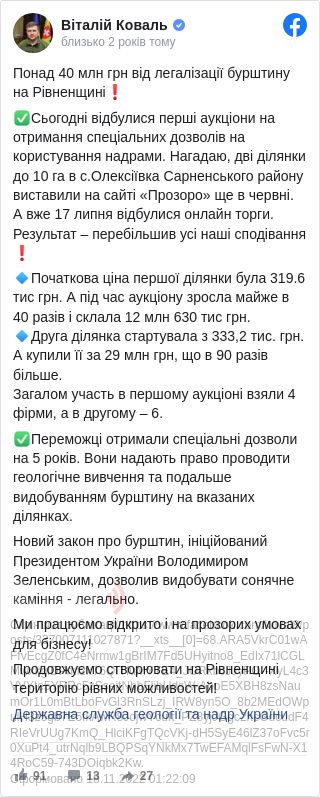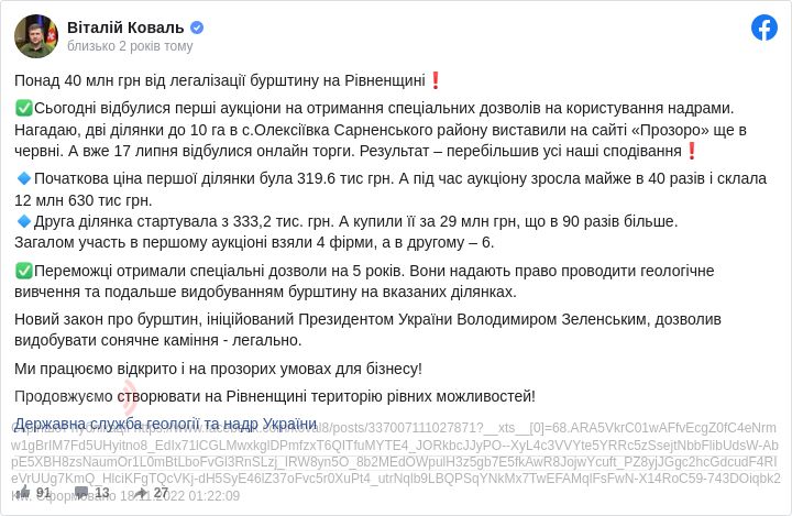 "Вже 17 липня відбулися онлайн-торги. Результат перевершив всі наші очікування. Початкова ціна першого ділянки була 319,6 тис. гривень. А під час аукціону зросла майже в 40 разів і склала 12 млн 630 тис. гривень. Друга ділянка стартувала з 333,2 тис. гривень. А купили його за 29 млн гривень, що в 90 разів більше", – зазначив Коваль.