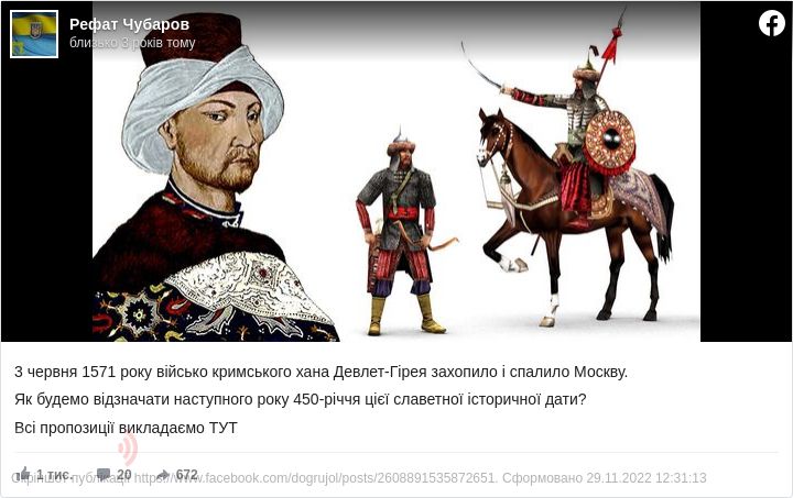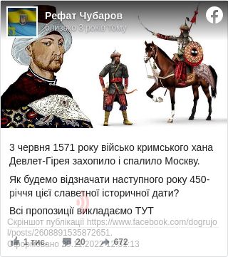 “3 червня 1571 року військо кримського хана Девлет-Гірея захопило і спалило Москву. Як будемо відзначати наступного року 450-річчя цієї славетної історичної дати?”, – написав він.