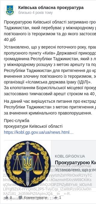"Прокуратурою Київської області затримано громадянина Республіки Таджикистан, який знаходиться в міжнародному розшуку за вчинення злочину, пов'язаного з тероризмом і до якого застосовано тимчасовий арешт терміном 40 діб", - йдеться в повідомленні.