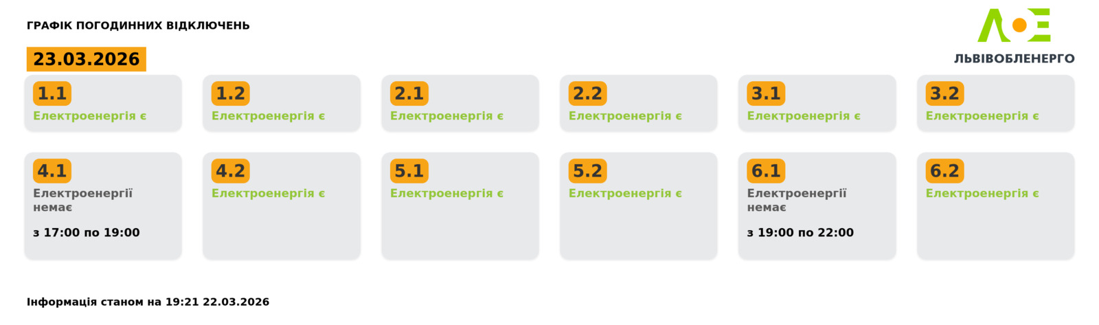 Група 6.1. Електроенергії немає з 19:00 до 22:00.