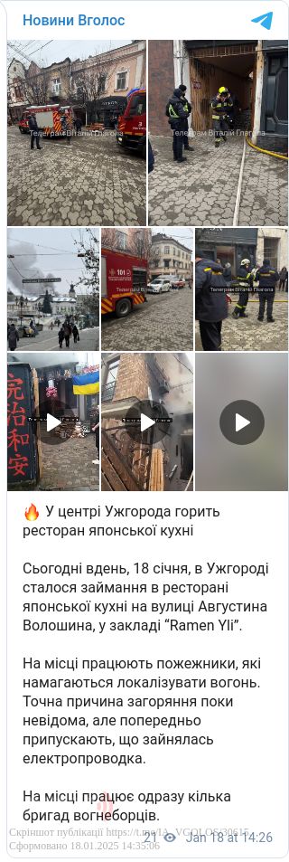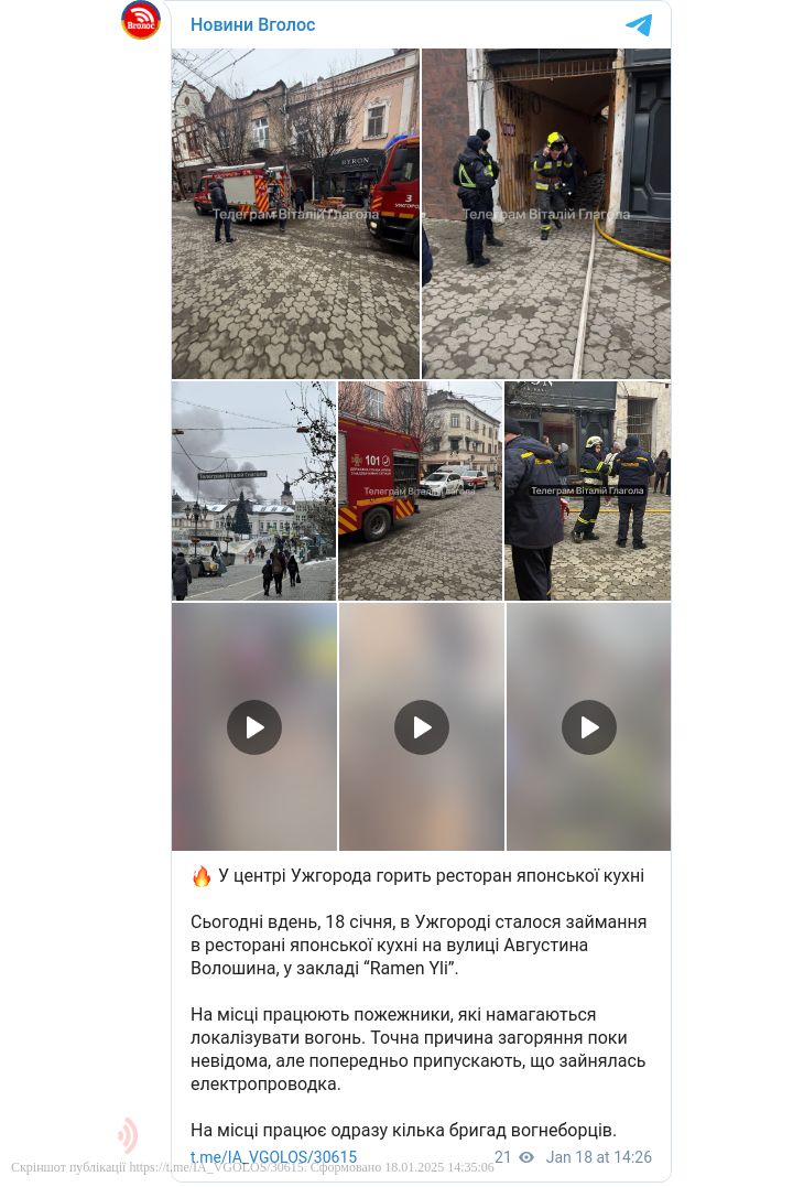 В Ужгороді сталося займання в ресторані японської кухні на вулиці Августина Волошина, у закладі “Ramen Yli”.