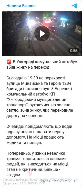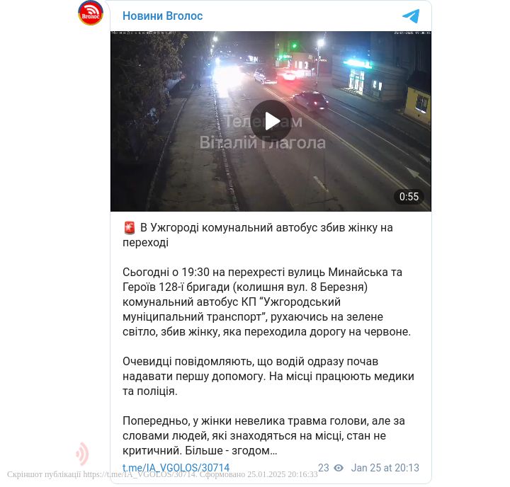 Сьогодні о 19:30 на перехресті вулиць Минайська та Героїв 128-ї бригади (колишня вул. 8 Березня) комунальний автобус КП “Ужгородський муніципальний транспорт”, рухаючись на зелене світло, збив жінку, яка переходила дорогу на червоне.