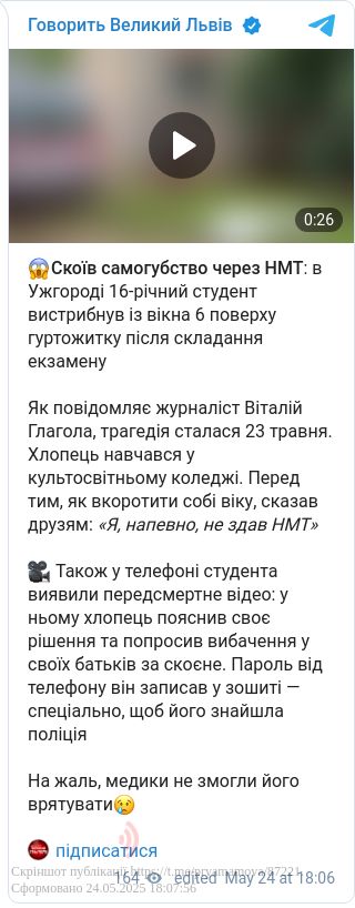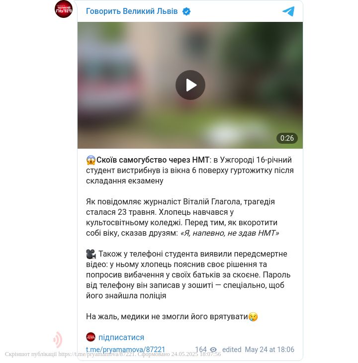 Згодом правоохоронці відкрили його телефон і виявили передсмертне відео, в якому юнак пояснив свій вчинок. Він говорив про глибоке розчарування через результат НМТ, просив вибачення у батьків, особливо звертаючись до матері, і перепросив за те, що зробить «за кілька хвилин».