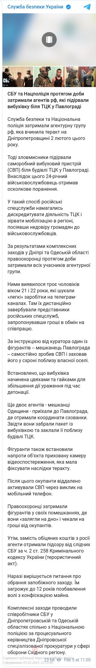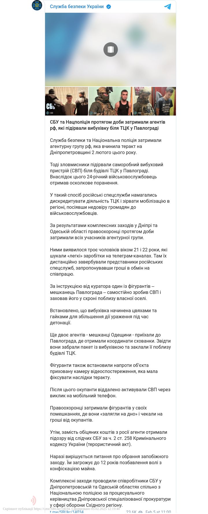 «Ними виявилися троє чоловіків віком 21 та 22 років, які шукали «легкі» заробітки у Telegram-каналах. Там їх дистанційно завербували представники російських спецслужб, запропонувавши гроші в обмін на співпрацю. За інструкцією від куратора один із фігурантів ‒ мешканець Павлограда ‒ самостійно зробив СВП і заховав його у схроні поблизу власної оселі. Встановлено, що вибухівка начинена цвяхами та гайками для збільшення дії ураження під час детонації. Ще двоє агентів – мешканці Одещини – приїхали до Павлограда, де отримали координати схованки. Звідти вони забрали пакет із вибухівкою та заклали її поблизу будівлі ТЦК», – розповіли у СБУ.
