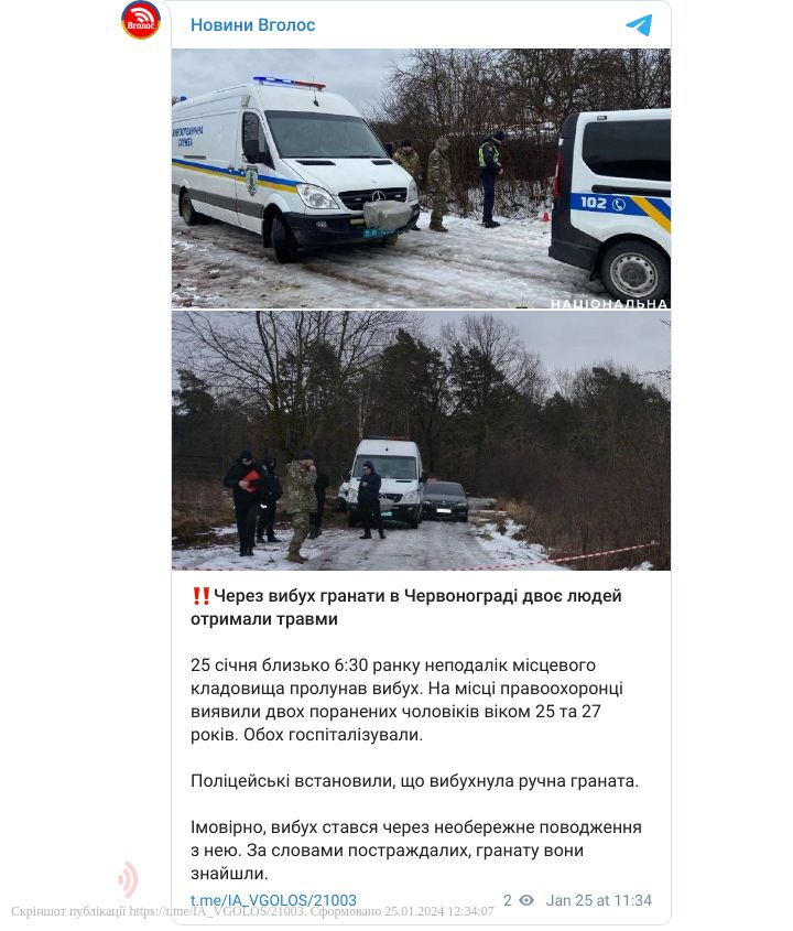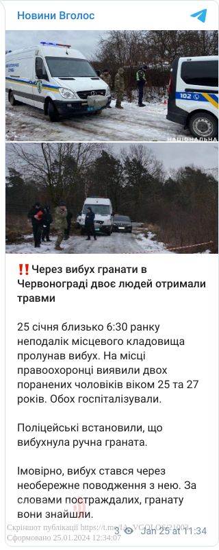 Сьогодні, 25 січня, близько 6:30 ранку до правоохоронців надійшло повідомлення, що у місті Червонограді неподалік кладовища стався вибух, через що постраждали люди.