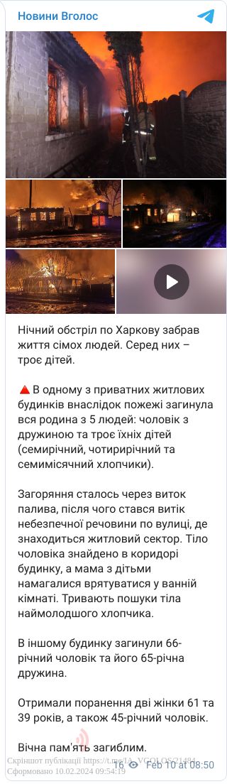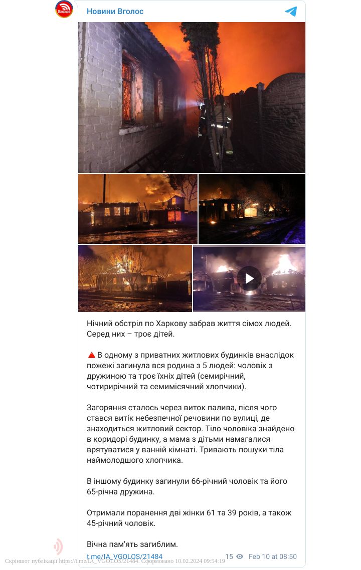 Після нічного російського обстрілу Харкова в одному з приватних житлових будинків внаслідок пожежі загинула вся родина з 5 людей: чоловік з дружиною та троє їхніх дітей – семирічний, чотирирічний та семимісячний хлопчики.