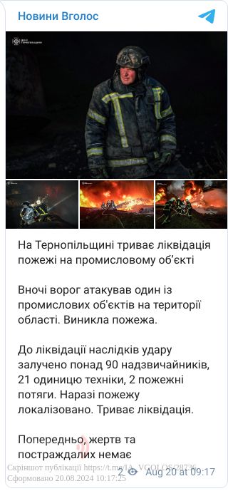 До ліквідації наслідків удару залучено понад 90 надзвичайників, 21 одиницю техніки, 2 пожежні потяги. Наразі пожежу локалізовано. Триває ліквідація.