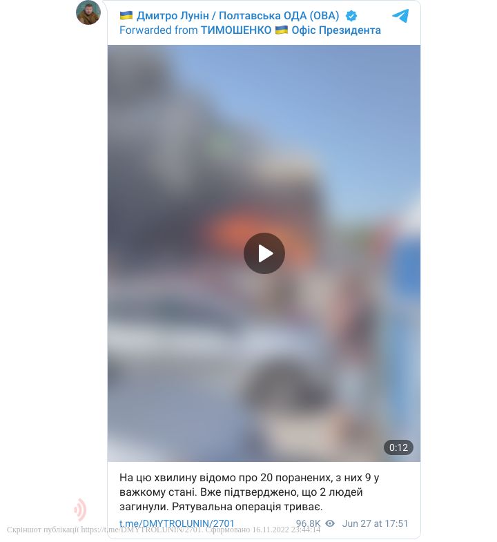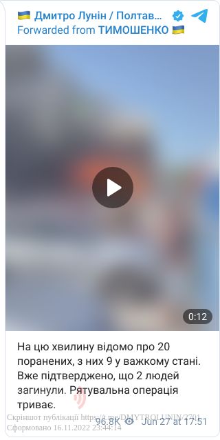 «На цю хвилину відомо про 20 поранених, з них 9 у важкому стані. Вже підтверджено, що 2 людей загинули. Рятувальна операція триває», - повідомив голова Полтавської ОВА Дмитро Лунін.