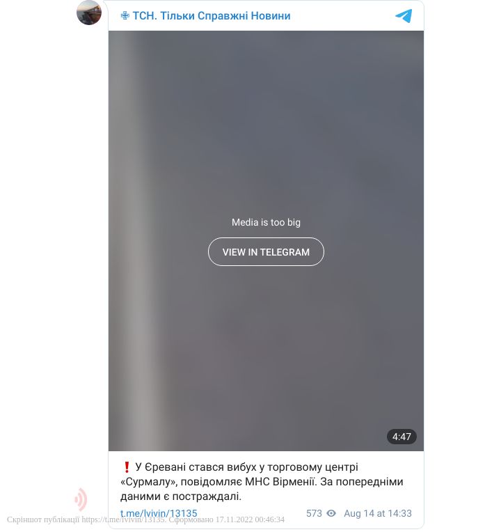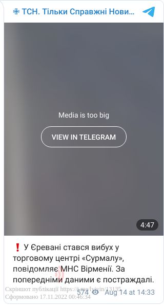 Внаслідок потужного вибуху в торговому центрі «Сурмалу» в Єревані, за попередніми даними, загинула 1 особа, 20 осіб отримали тяжкі поранення.