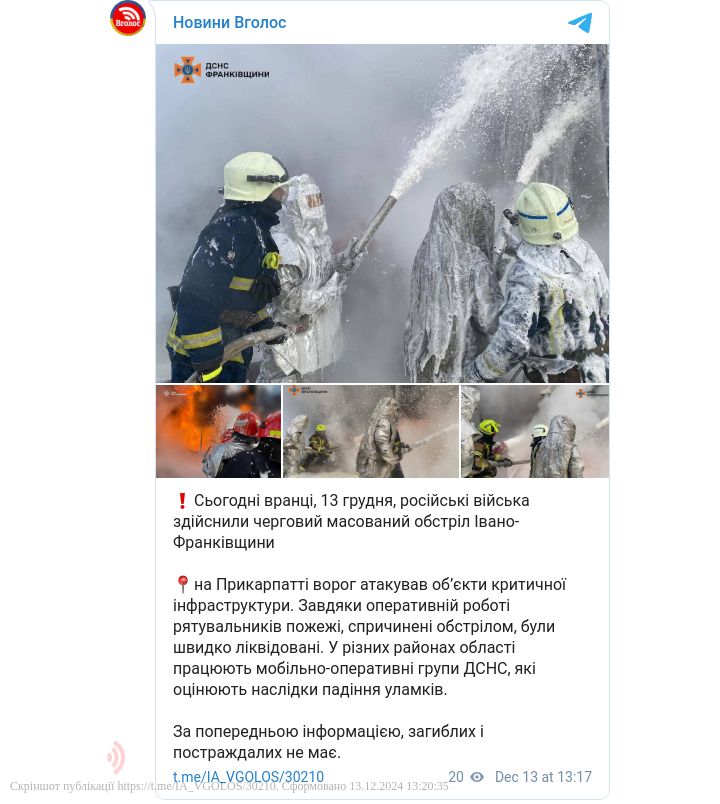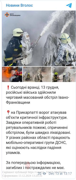 Сьогодні вранці, 13 грудня, російські війська здійснили черговий масований обстріл Івано-Франківщини